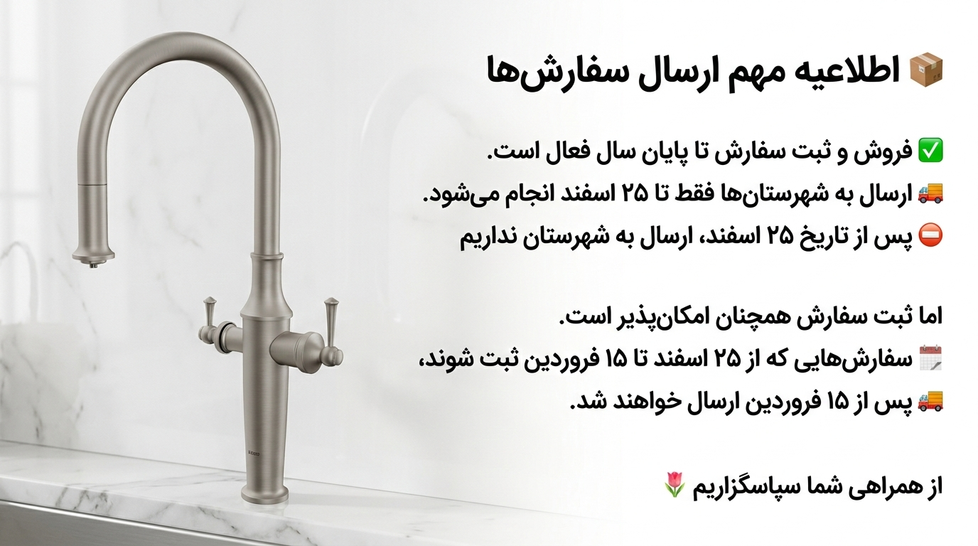 - برای افزایش طول عمر محصول خریداری شده , هر ماه دوبار با مایع صابون و دستمال نخی نرم , شیرآلات را شستشو دهید.